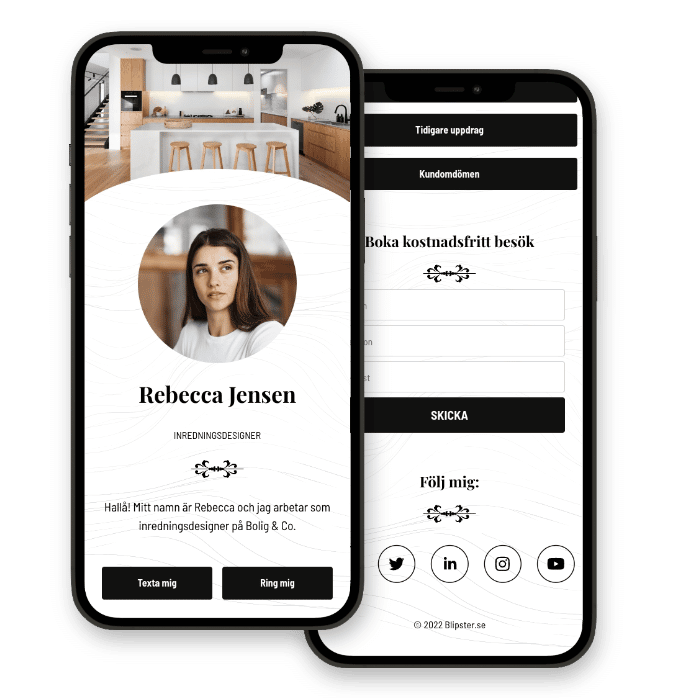 Vi skräddarsyr ditt visitkort från Blipster efter ditt varumärke med din logotype och ditt företags färger. Glöm begränsade mallar som du behöver anpassa dig efter. Du väljer själv vilken information du vill presentera samt vilka bilder och videos som ska användas.